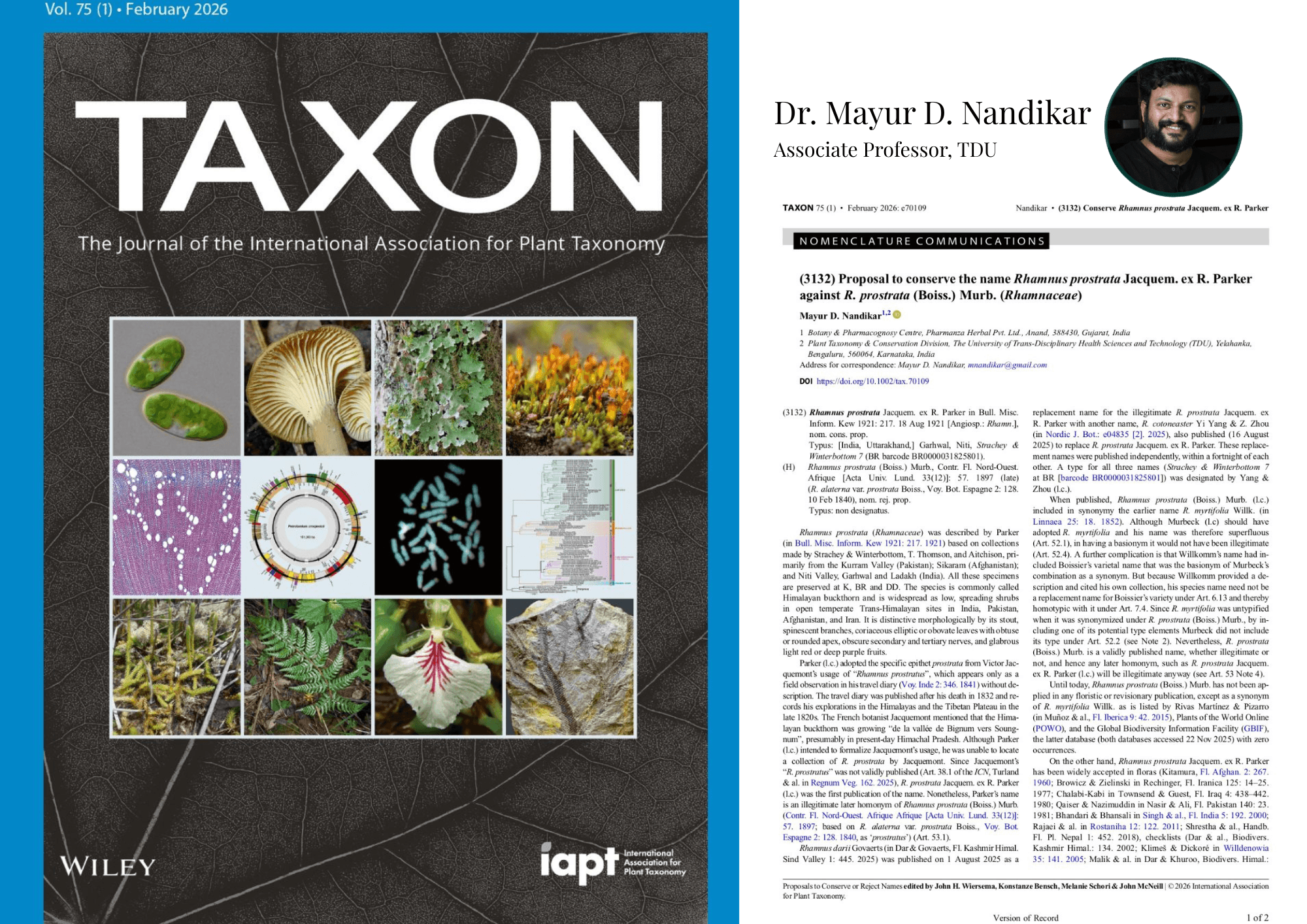 Nandikar, M. D. (2026). Proposal to conserve the name Rhamnus prostrata Jacquem. ex R. Parker against R. prostrata (Boiss.) Murb. (Rhamnaceae). TAXON, 75(1), e70109. https://doi.org/10.1002/tax.70109