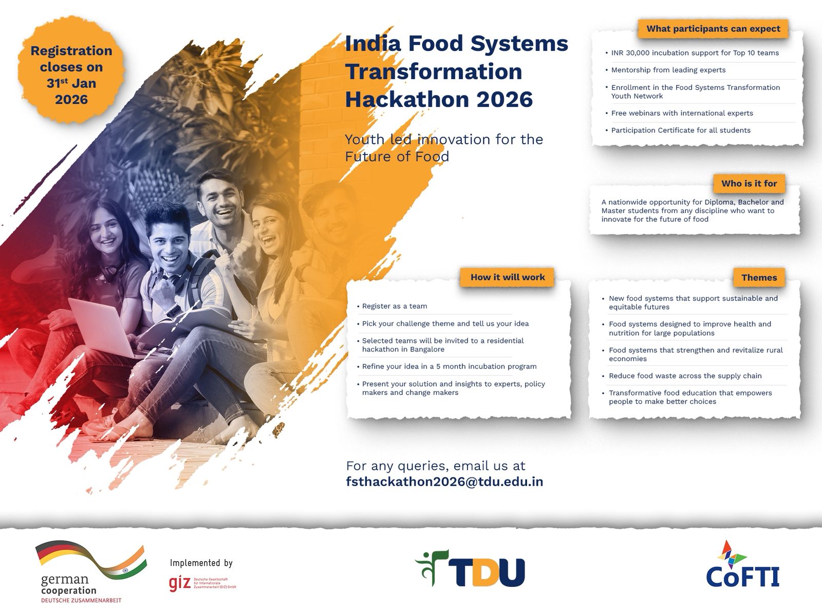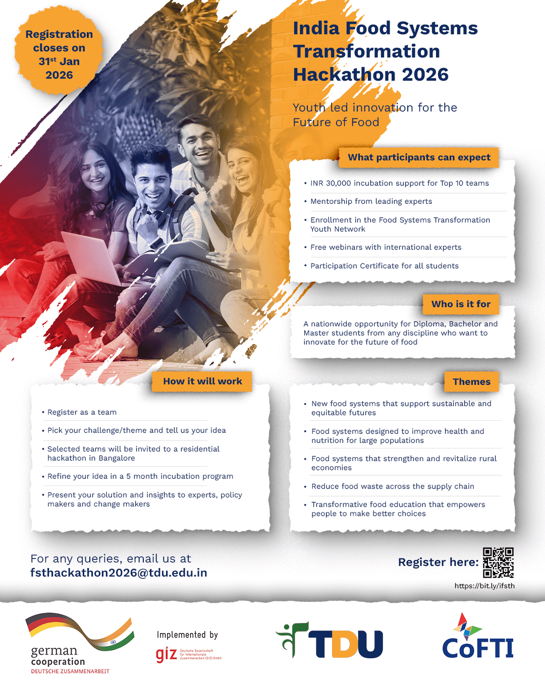 The Food Systems Transformation Hackathon 2026 encourages university students across India to become next-generation changemakers. Through challenge-based learning, interdisciplinary teamwork, mentorship and immersive experiences, participants will explore innovative pathways to create sustainable, inclusive and health-promoting food systems for the future.